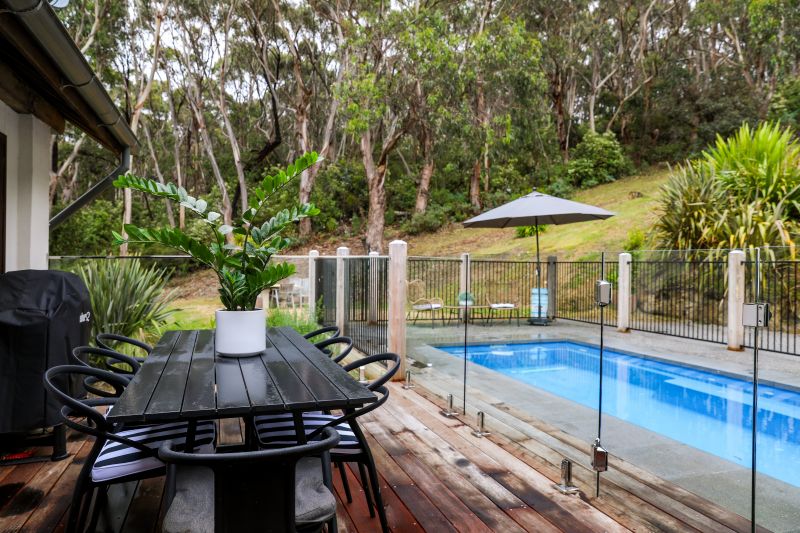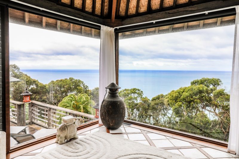 Cascading a couple of steps, the signature room of the residence is exposed and the formal living area with expanses of glass, Lorne in full view and stone surround open fire place ensure year-round enjoyment.