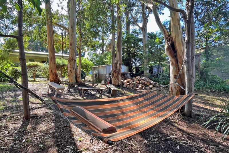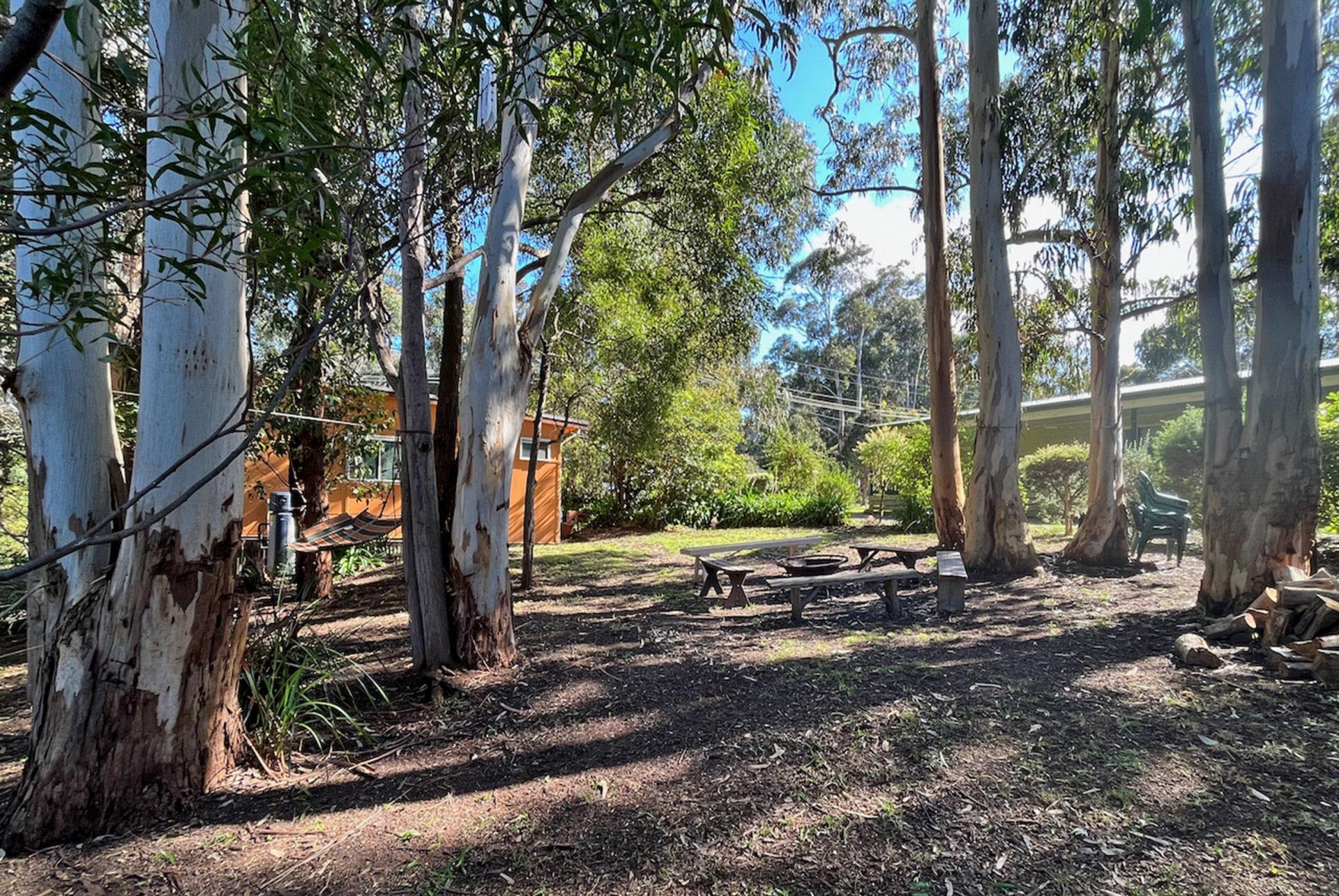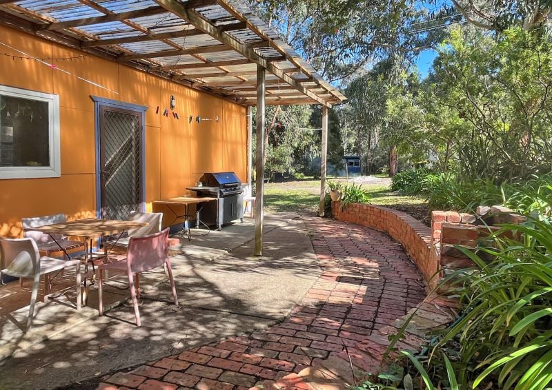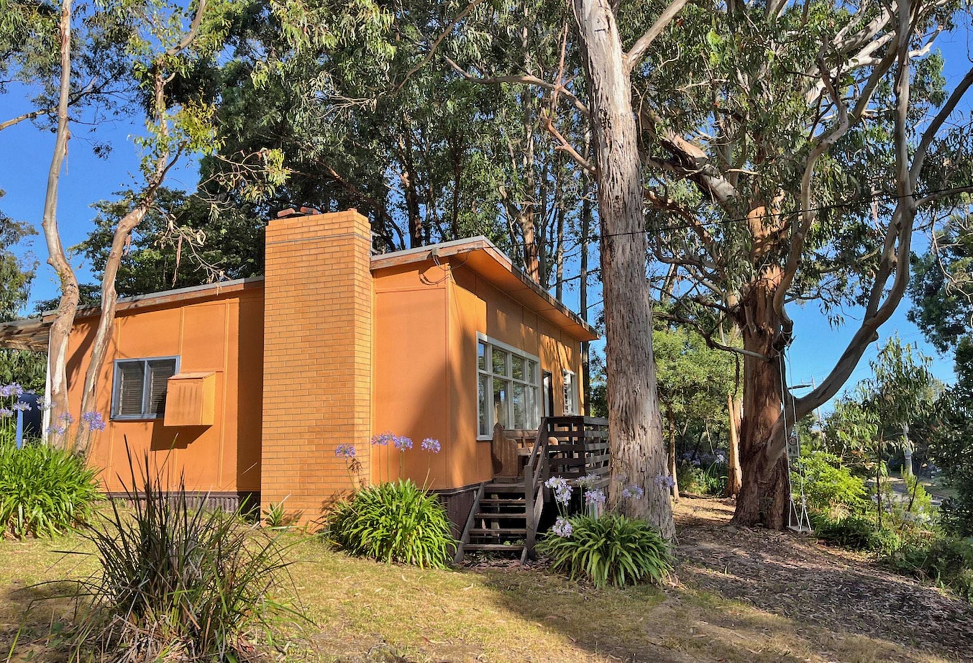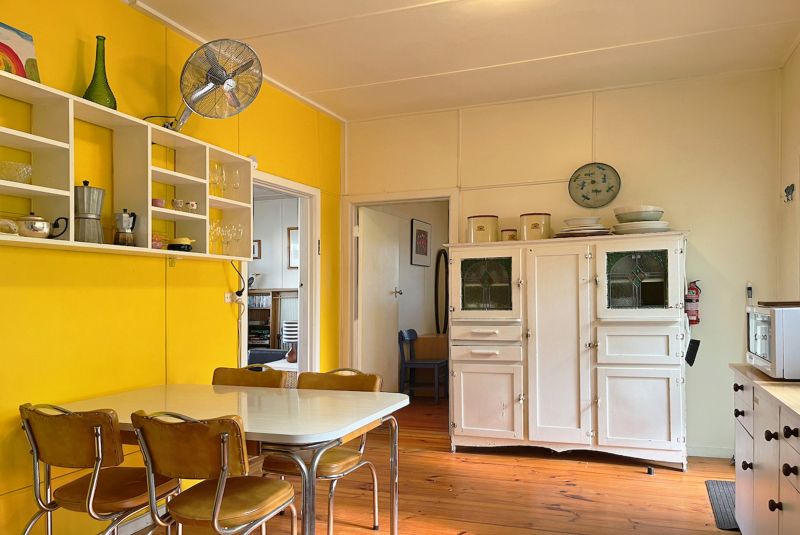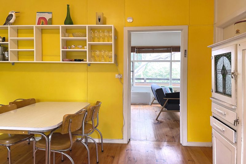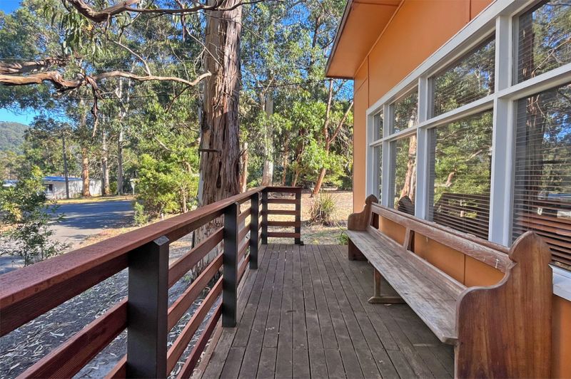 Set in a tranquil environment amongst majestic gum trees, this property has pretty mountain views from the elevated front deck and a large bush garden with paved area including a brick barbeque for outdoor entertaining. Inside, there are two double bedrooms and a bunk room, all serviced by a central bathroom. The large lounge and dining rooms are heated by a Nectre wood burner built into the original oak bookcases. The generous kitchen still maintains its original cabinetry. Other retained original features of this classic building style include strapped walls and high ceilings, a built-in retro buffet in the dining room and stunning original glass feature doors. These quirky details throughout the home transport you back to the 60s, while offering the opportunity to renovate and modernise still retaining that retro charm.