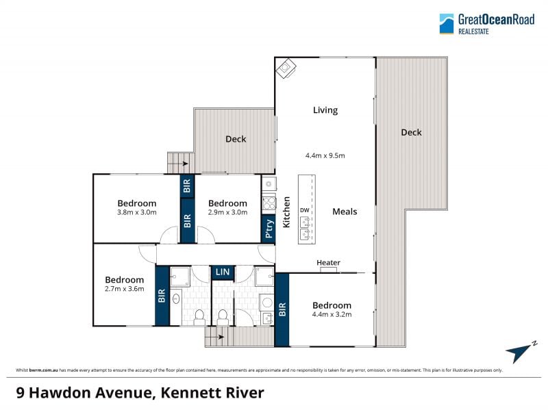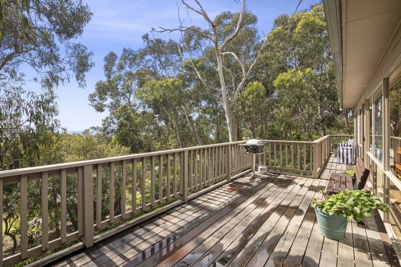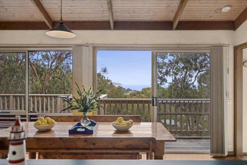 Featuring a stunning ocean, coastline and Otway National Park vista from multiple vantage points throughout this home. The open plan kitchen/dining/living room opens out onto the North facing deck with ocean views towards Wye River and Aireys Inlet or rear West facing sun deck and is the 'centerpiece' room to enjoy the view. Beautiful hardwood flooring, a well-appointed kitchen, wood heater, split system unit, ceiling fans and ceiling to floor glazing all contribute to the enjoyment of this living space.