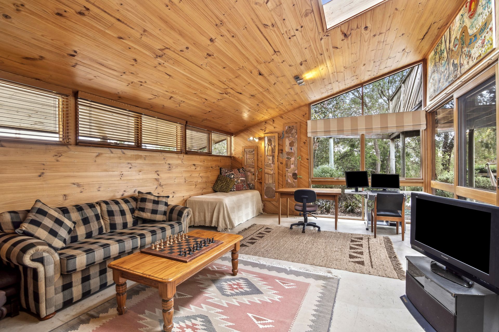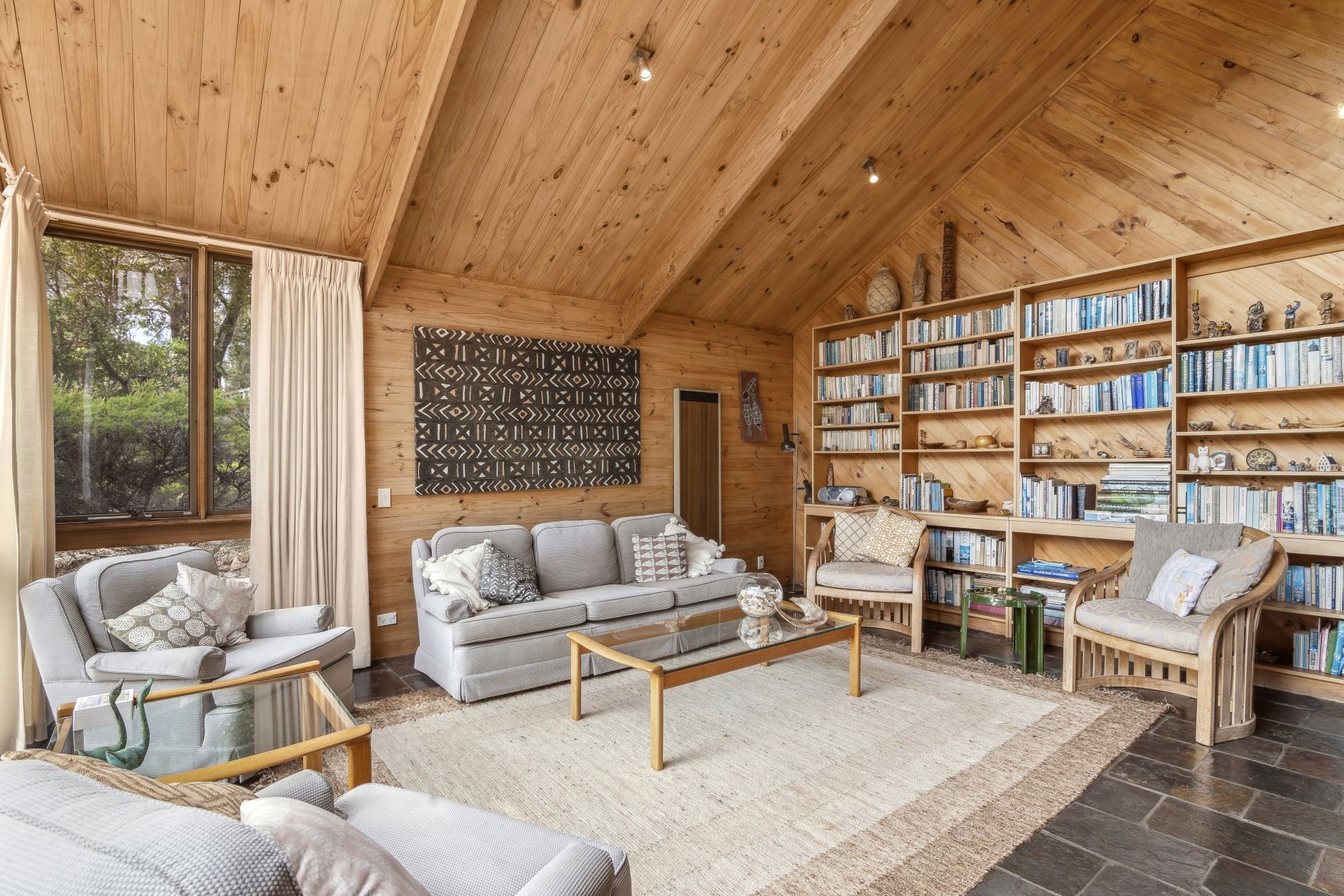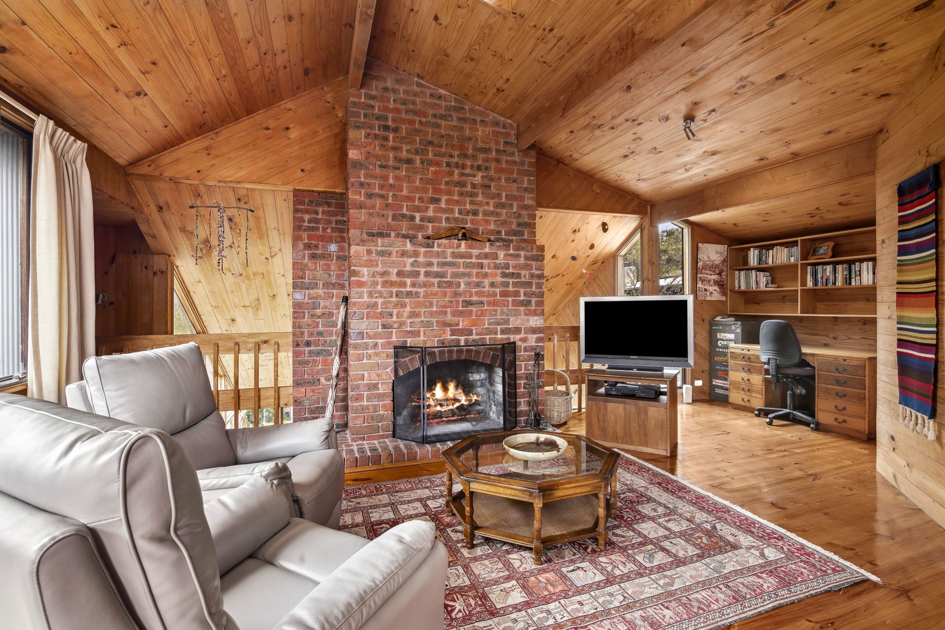 Warm and inviting, the design features beautiful cedar beams, pine lining, and a striking central brick structure with three functional fireplaces, adding character and coziness to every room. Large windows capture stunning treetop views, seamlessly integrating the home with its natural surroundings, making it a truly unique living experience.