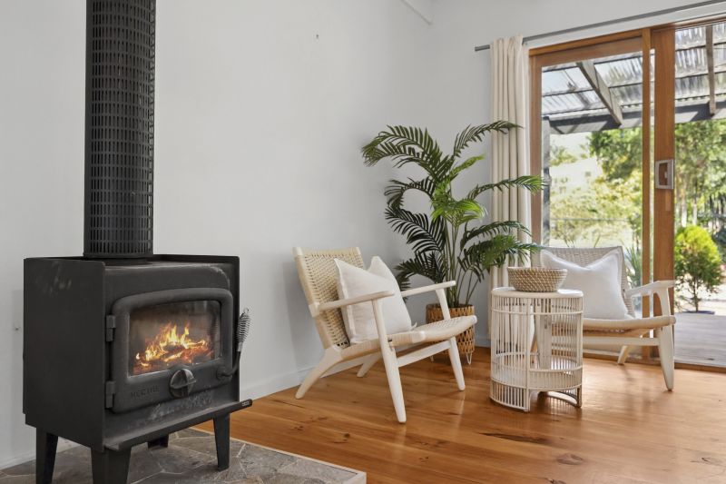 A large living room with a wood-fired heater creates a warm, inviting space, while the dining area and well-appointed kitchen make everyday living and entertaining a breeze.