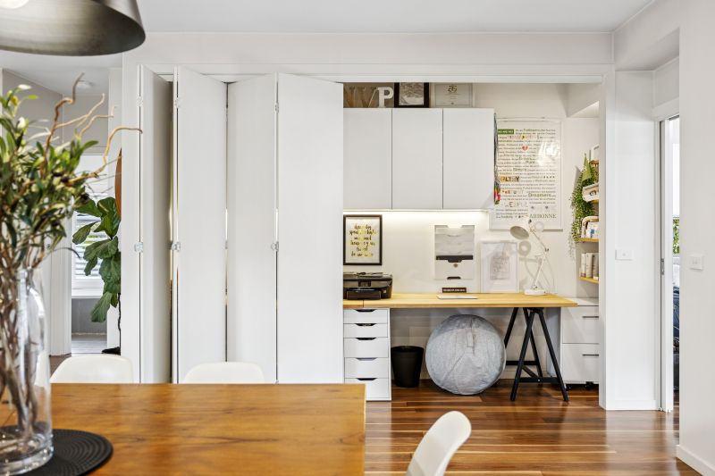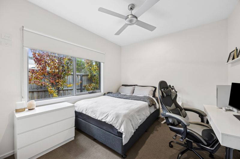 Accommodation is generous, with an oversized master suite featuring a walk-in robe and stylish ensuite. Two additional double bedrooms include built-in robes and are serviced by a central family bathroom with a full-size bath. A purpose-built study is tucked discreetly behind bi-fold doors, offering a dedicated space to work or study.