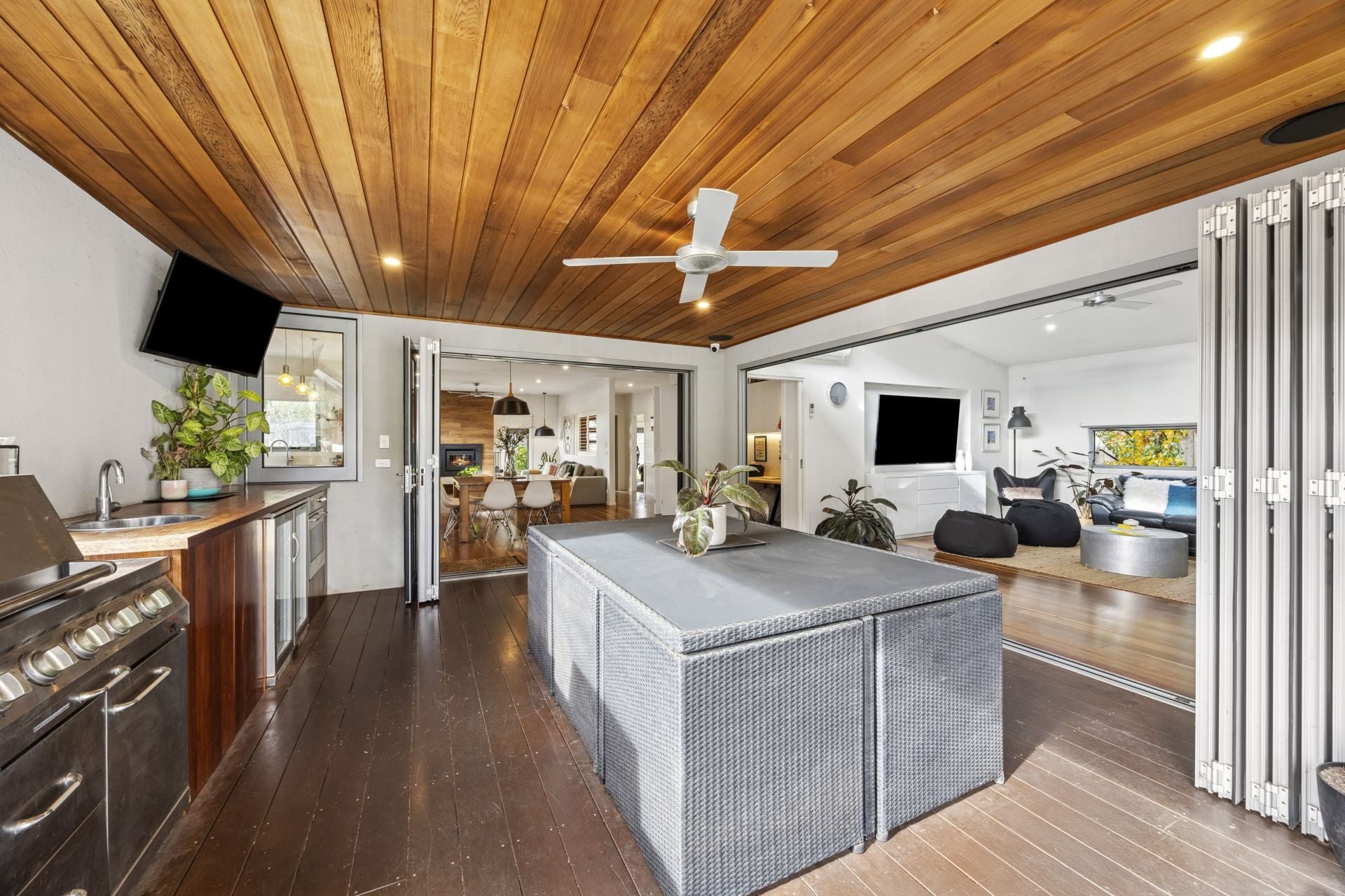 The outdoor kitchen-complete with BBQ, oven, sink, and under bench fridge with mechanical screens providing comfort no matter the season.