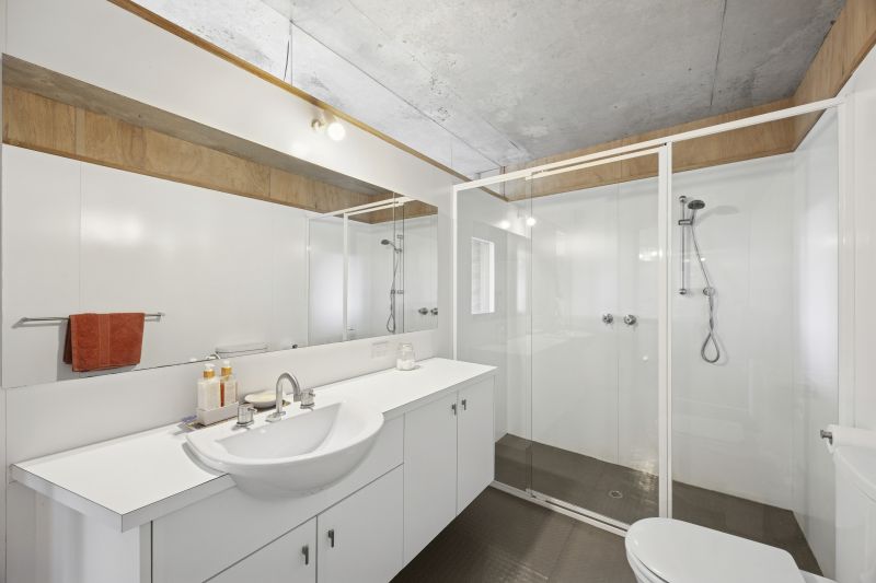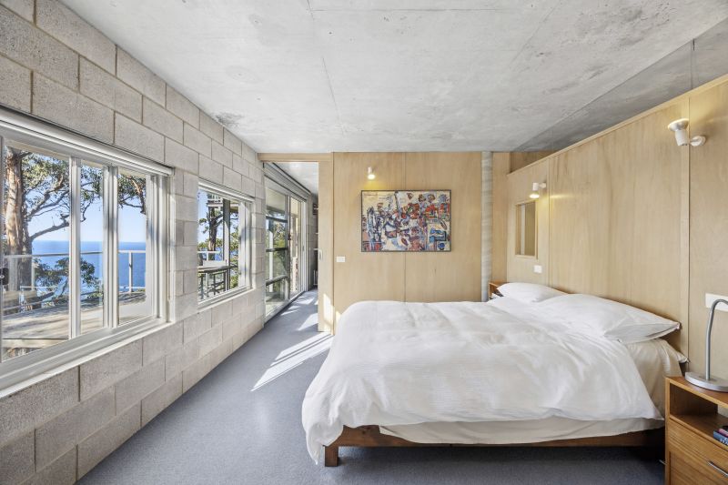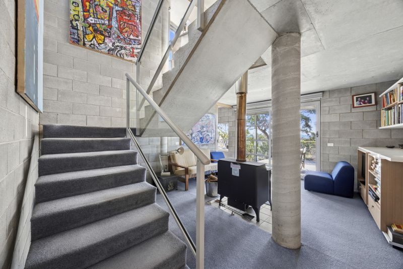 A fine example of a rural / coastal retreat, the completely off grid home blends effortlessly into the landscape and was designed by renowned Surfcoast architect Andy Sprogis. With a Northern orientation the home opens into a stunning, light filled g open plan kitchen/dining/lounge area. Downstairs is a second living area, bathroom and two bedrooms, one with ensuite. A study and a large artist studio allow scope for conversion to further bedrooms.